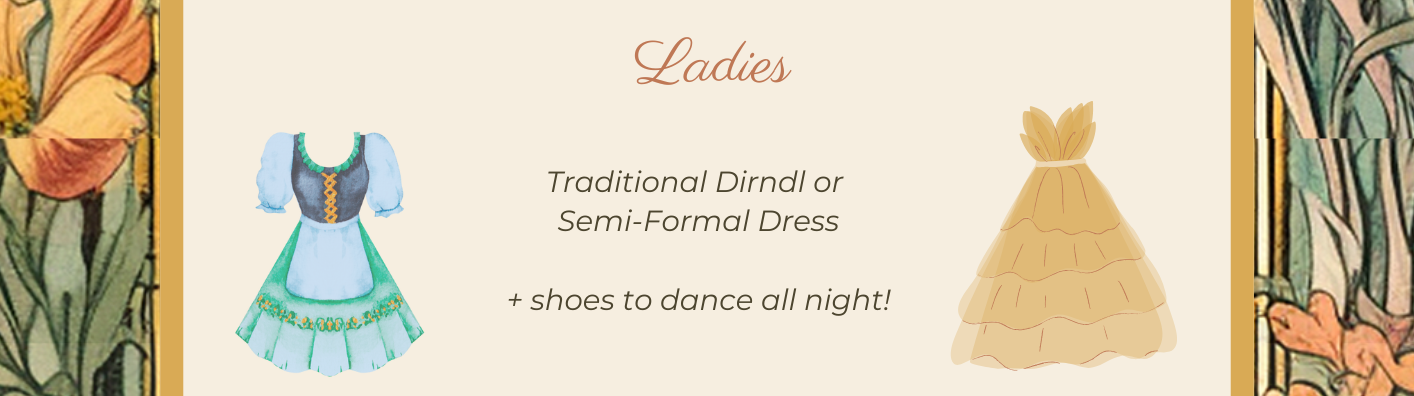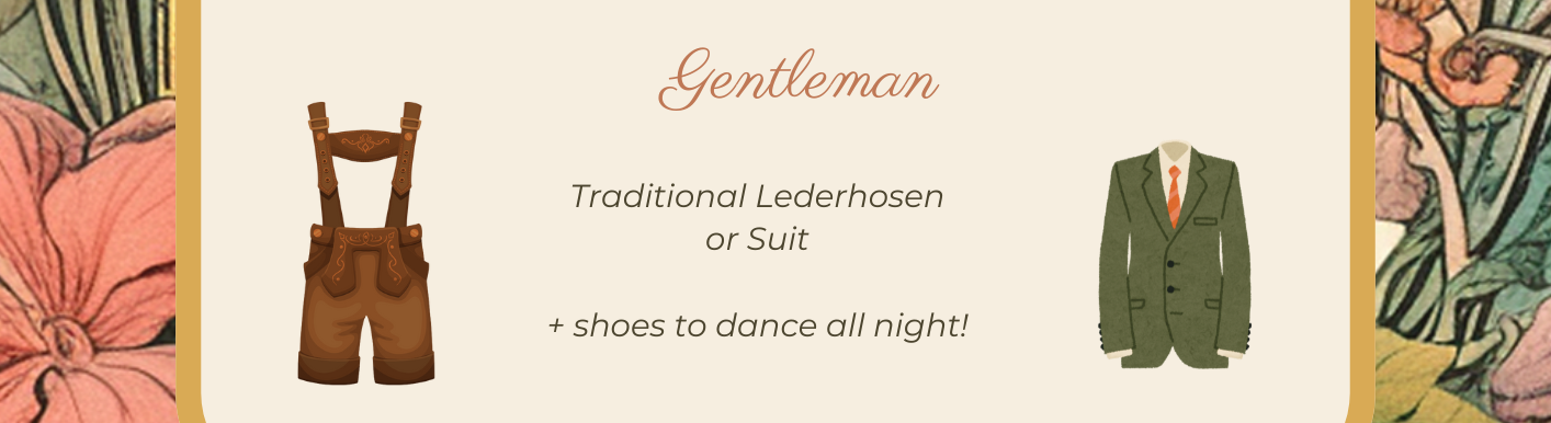 'Trachten Hochzeit' or 'Traditional Wedding' celebrates the timeless German and Alpine attire, like dirndls and Lederhosen. We're thrilled to honor this tradition at our wedding and invite you to join in by wearing a dirndl or Lederhosen. If you'd prefer something more formal, that's perfectly fine too.